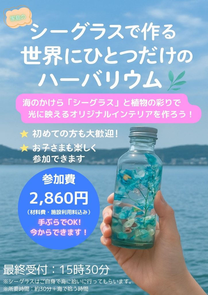 家島交流センターでは、新しく 「シーグラスハーバリウム体験」 をお楽しみいただけるようになりました。